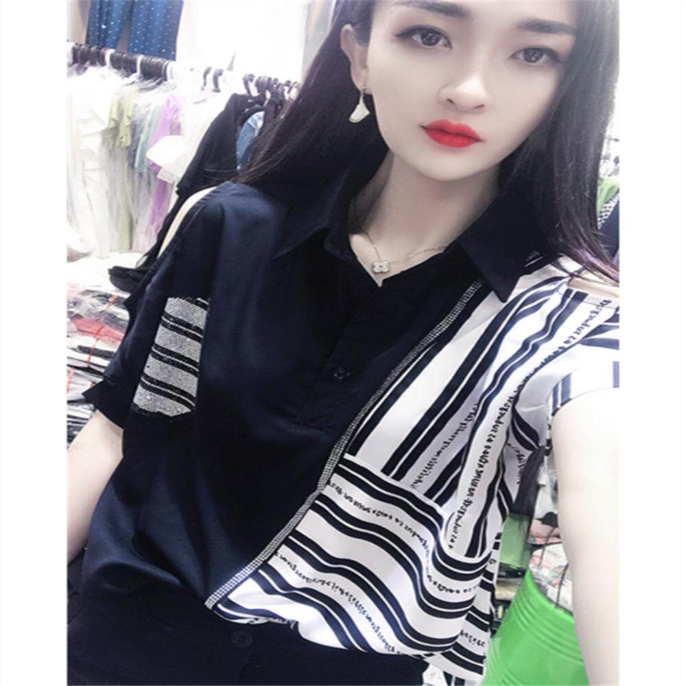 夏季新款镶钻宽松大版短袖衬衫女设计感小众条纹雪纺衫露肩上衣潮热门设计联盟服务商